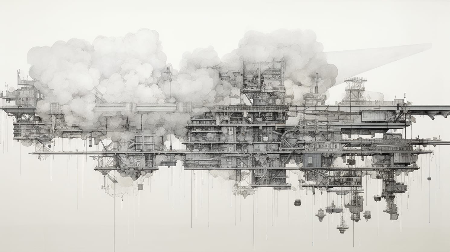 Clouds collects visions generated by the artificial imagination, where the sky and clouds are thought of as forms in latency. These structures do not represent the clouds, but emerge from them. They are born from the same instability, the same swelling and dissolving that defines the plane.