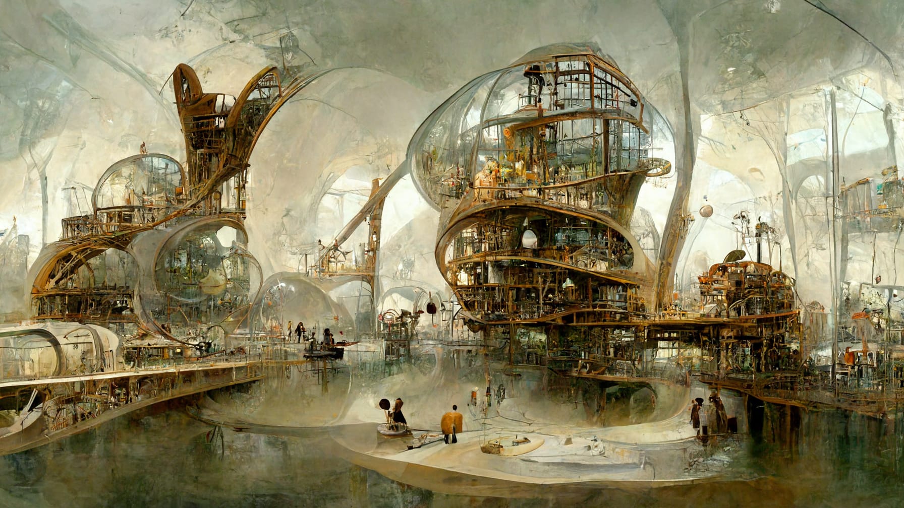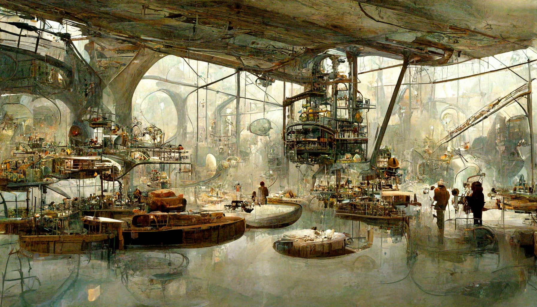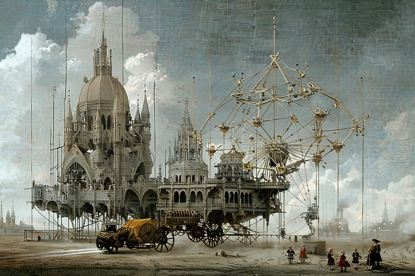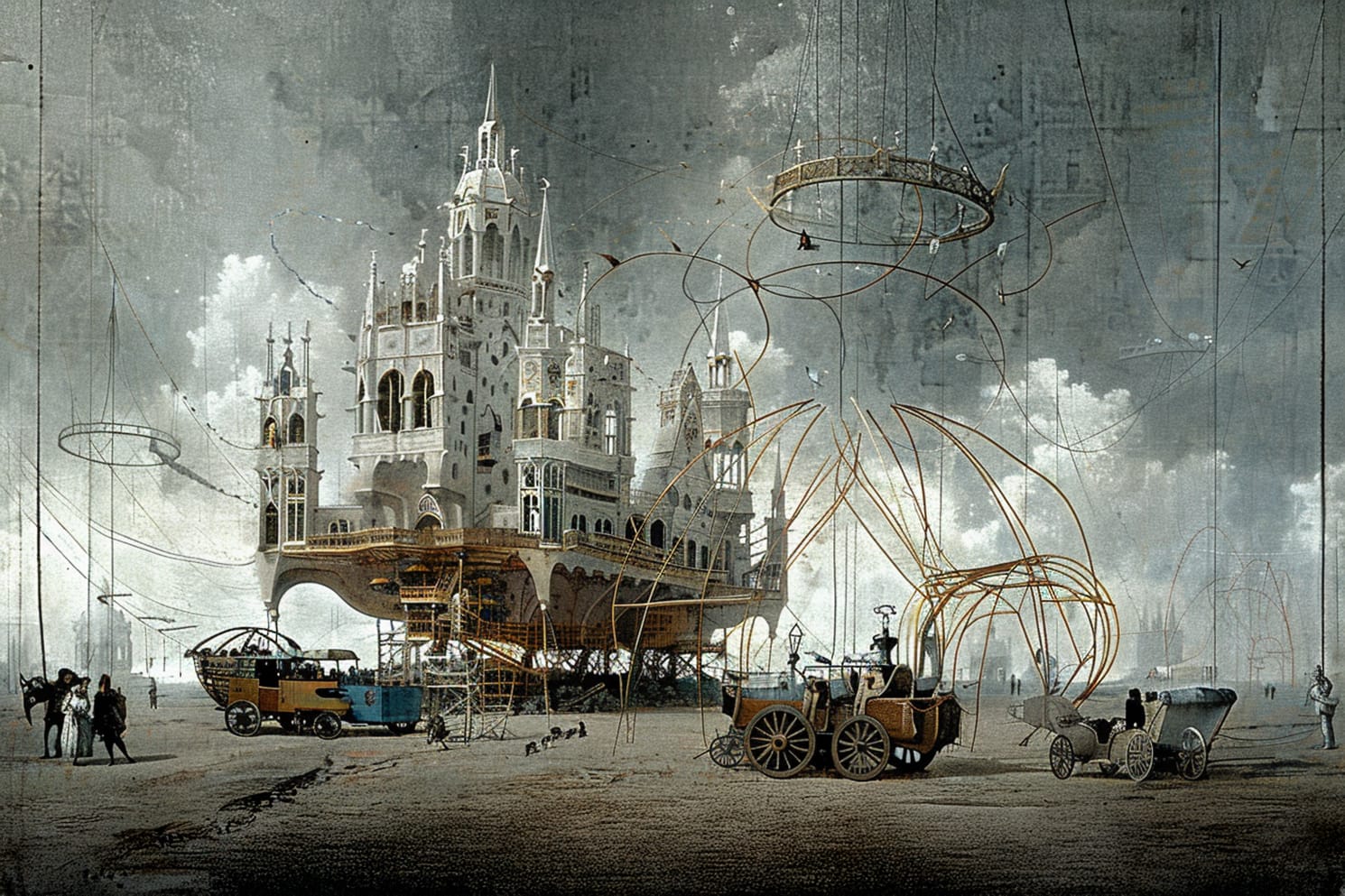 Constructed as a theatrical organism, Cosmion gathers domes, loggias, suspended bridges, alchemical cranes, dark chambers, and floating platforms. It has no defined function, but many potential ones: it may be a celestial observatory, a world theater, a nomadic library, a provisional cathedral, a time machine. It is a transportable microcosm, a container of worlds—or perhaps the world itself, reduced to threshold and enigma.